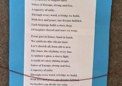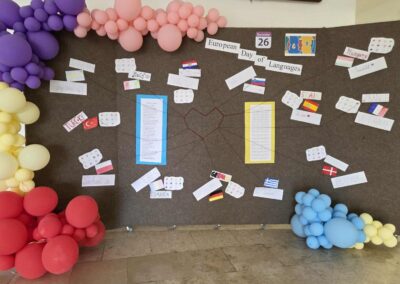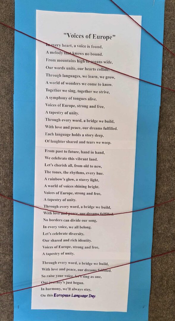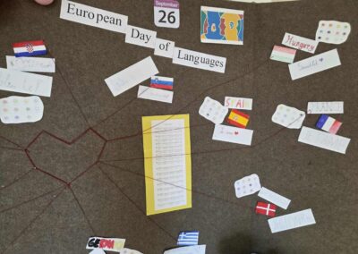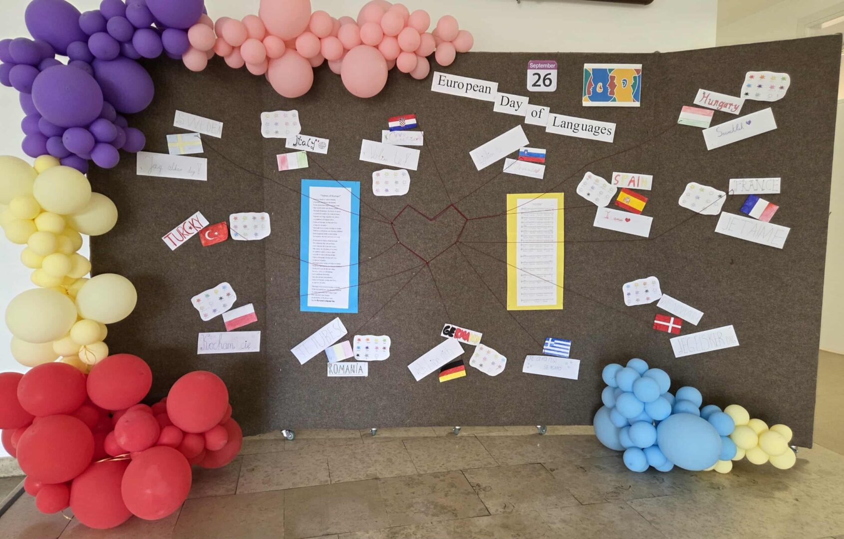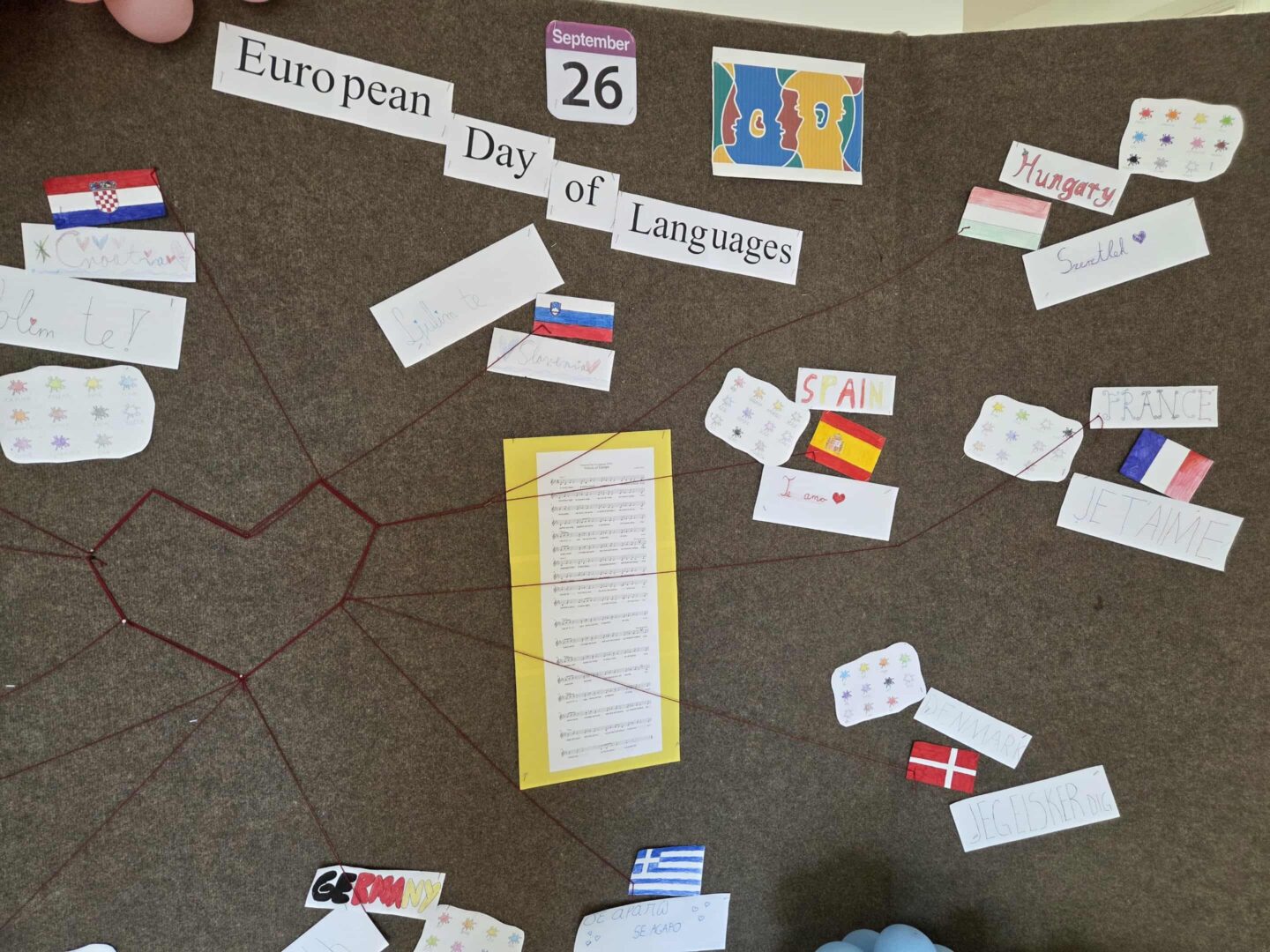 Europski dan jezika (26.9.) obilježen je i ove godine u našoj školi različitim aktivnostima. Ovogodišnji moto je „Languages open hearts and minds“. Na nastavi engleskog jezika učenici 5.razreda rečenicu „I am __(nationality)!¨pisali su na različitim jezicima i tako se predstavljali, a izradili su i zastave. Učenici 8.razreda su na Internetu istraživali kako se pojedine države zovu na engleskom jeziku i to su zapisali. Učenici 7.razreda su u govorne balončiće upisivali rečenicu „Volim te“ na različitim jezicima koje su istraživanjem pronašli, a učenici 6.razreda su morali otkriti kako se osnovne boje nazivaju na različitim jezicima. Osim istraživanja, neki učenici 8.razreda su prihvatili izazov i pokušali prevesti pjesmu „Voices of Europe“ koja je himna Europskog dana jezika. U holu škole ukrašen je i pano, i na taj način pokazani učenički radovi. QUOT LINGUAS CALLES, TOT HOMINES VALES. (Koliko jezika znaš, toliko ljudi vrijediš.)